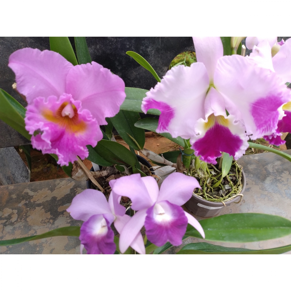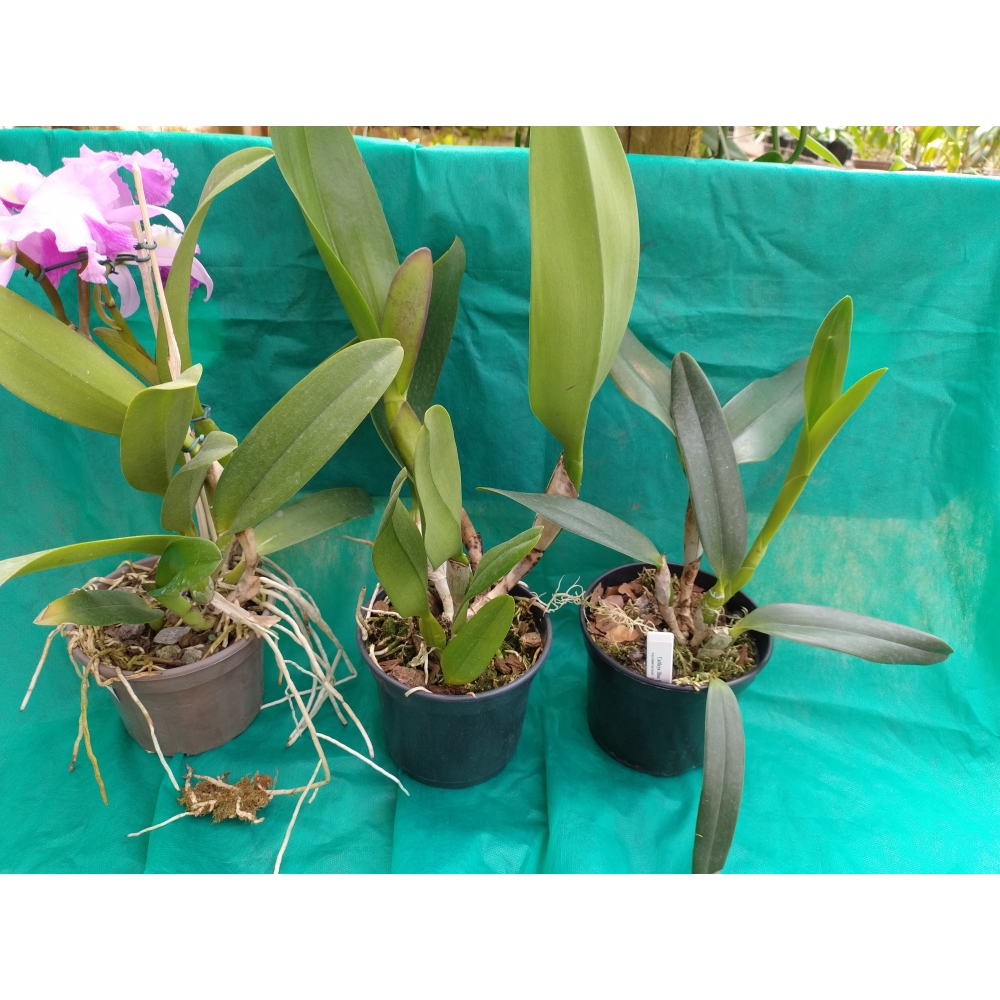 O kit contém 3 orquídeas adultas com identificação:
